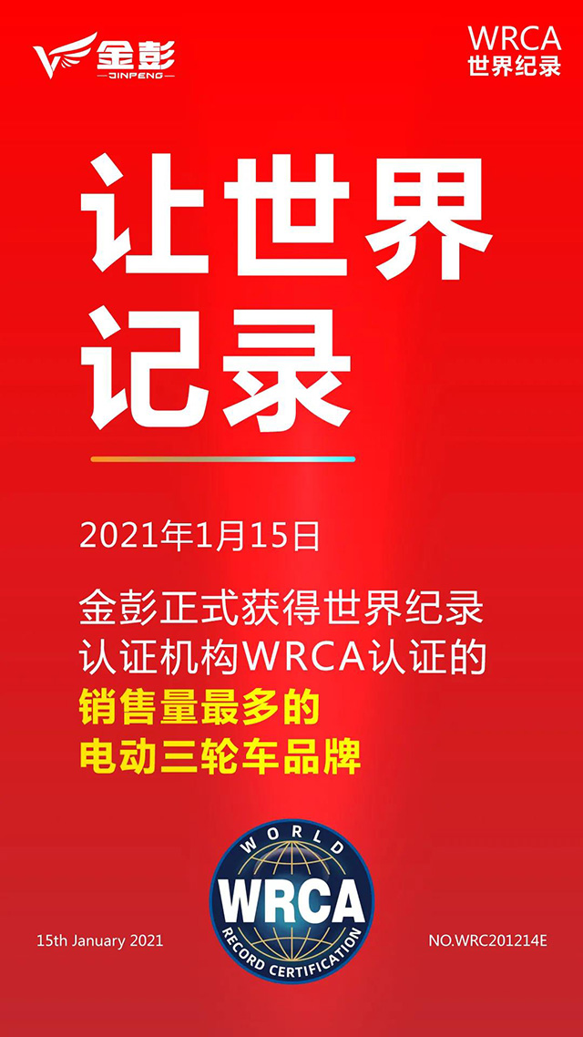 2020年底,金彭以“累計電動三輪車銷量1360萬輛”正式向WRCA申請挑戰“銷售量最多的電動三輪車品牌”世界紀錄,經過WRCA官方的嚴苛審查和反復論證,最終認定金彭挑戰成功,并將其記入世界紀錄大全史冊,金彭的“世界之最”終于得到了國際權威機構的認可。