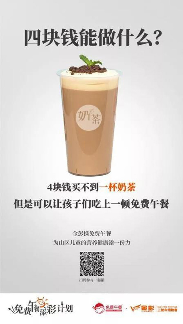 今年的6月1日,金彭將再次攜手免費午餐,前往河南南陽臥龍區龍王溝風景區陳家崗小學,針對此次公益活動,金彭發起了添彩計劃支援者征集令。